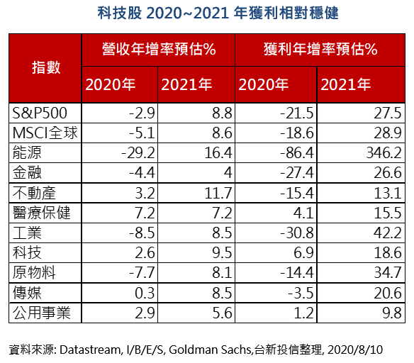 就基本面分析,美國企業財報表現亮眼,多數公司第二季財報輕易打敗預期,符合預期比例高達近84%,獲利衰退亦大幅優於先期預期。雖然許多公司未公布財測目標,但暗示下半年表現有望較上半年好,疫情的影響還在,但整體不確定性降低,分析師已上修半數以上產業2021年獲利成長預估,並估計S&P500成份股獲利將由2020年負成長21%大幅躍升至2021年正成長27%,多數科技公司(尤其龍頭企業)財報大幅優於預期,展望亦不差。