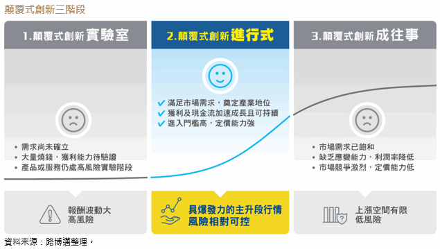 而投資顛覆式創新的要訣在於布局位於「顛覆式創新進行式」的加速成長企業。這是因為企業在初期階段只能大量燒錢來探索需求,投資報酬波動大且風險高;而進入成熟階段後,通常代表需求已飽和,企業缺乏定價能力且獲利空間小。投資在正值「顛覆式創新進行式」的中期階段才能掌握主升段行情,更重要的是獲利及現金流皆有可持續性,具備長線投資價值。