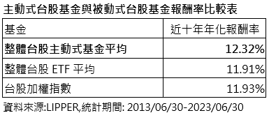 據投信投顧公會最新數據統計,135檔國內股票型基金、即主動式台股基金規模在6月推高至4,374.57億元,創下自2008年5月後的新高水準,而淨值成長正是整體基金規模創高的好推手。分析過去十年,主動式台股基金平均年化報酬高達12.32%、累積報酬率達236.3%,不但打敗台股加權指數年化報酬11.93%,也優於台股被動式ETF(即投信投顧公會分類之國內指數股票型) 平均11.91%的年化報酬。顯示台股指數強勢走升、屢屢創高之際,「選股」便成為投資致要關鍵,再以今年上半年在台股加權指數大漲近20%為例,主動式台股基金因具備「台股好市場」與「選股好機會」平均報酬率更高達33%,再度展現主動式經理人超額報酬成果,以及主動式台股基金確實為投資人帶來長期資產累積效益。