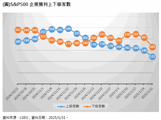 從美國OECD領先指標也觀察到同樣的現象,美國OECD領先指標持續上揚,顯示企業獲利持續上揚機會大,惟成長趨緩;進一步觀察截至1月底為止的S&P500企業獲利上下修家數,可以發現不論是上修家數或是下修家數,相較前一周皆呈現下滑,下修家數下滑20.28%,上修家數下滑18.12%,下修家數下滑幅度大過上修家數下滑幅度的情況下,易帶來股市震盪(圖)。