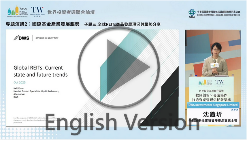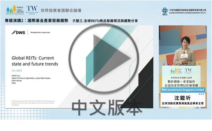 主講人:DWS Investments Singapore Limited 產品部 全球流動性實質資產產品專家主管沈鎧圻 女士