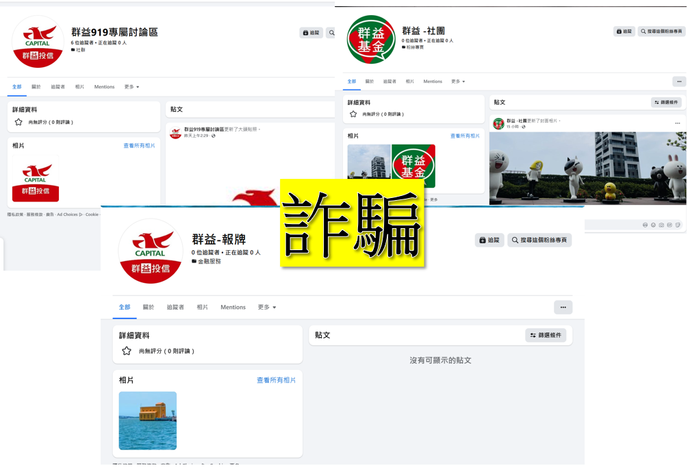 近日接獲投資人反應,發現坊間有不明人士假冒群益投信官方臉書專頁以進行詐騙。