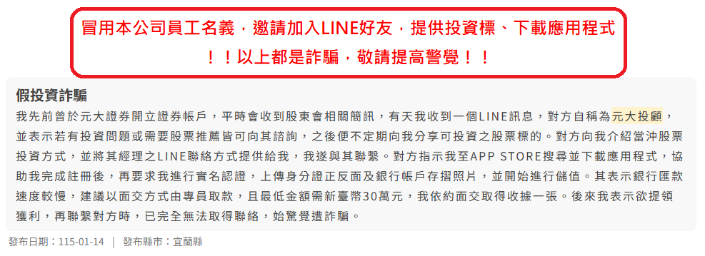 二、 冒用本公司員工名義推介金融交易平台或金融商品(本公司目前未授權業務員個 人於社群媒體或交友軟體提供投資顧問服務,請勿上當):