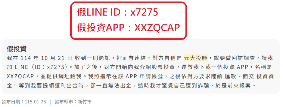 (二) 歹徒利用社群媒體或交友軟體之假帳號,冒用本公司名義向投資人提供投資建 議,偽稱提供投資計劃或推薦與本公司產品近似之投資標的,以騙取投資人資 金。