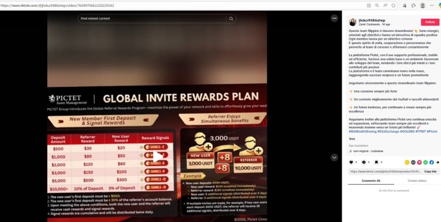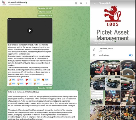 Telegram 群組:「Pictet Official Channel」(t.me/Pictet_Group),於 2025 年 12 月 13 日成立(該群組刊登菲律賓不明人士的照片,聲稱為Pictet 工作)。
