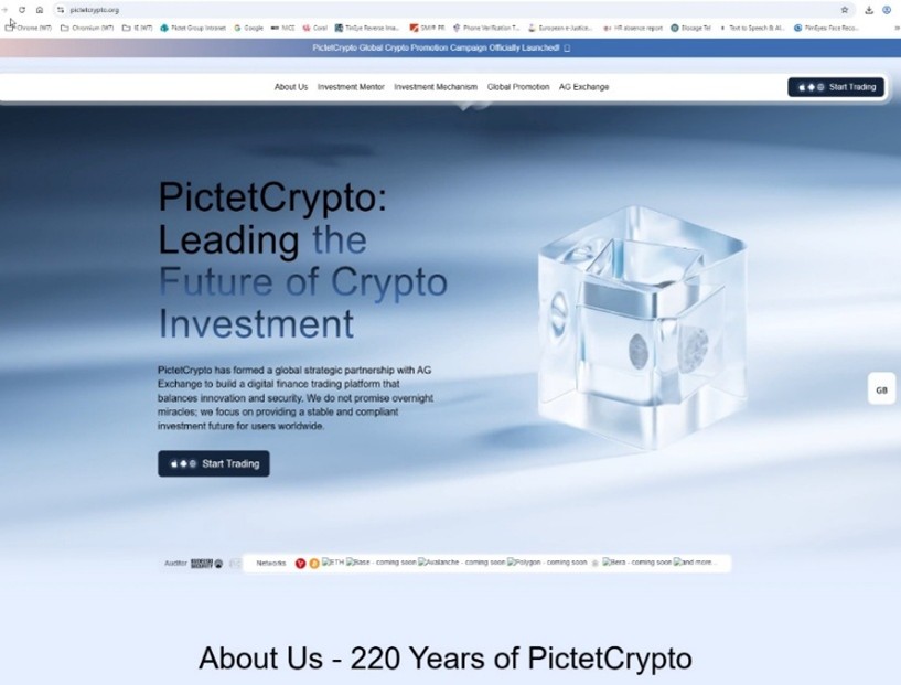 被招募的成員會被引導至假網站 www.pictetcrypto.org(2026 年 2 月 13 日創建),該網站使用我們的名稱、標誌及百達員工的照片。此假網站提供法語、英語、阿拉伯語、德語、意大利語及西班牙語版本,並重導至另一個舊網站 www.ag1in.com(2025 年9月25日創建),受害者被鼓勵在該網站開設帳戶並下載假的加密貨幣交易應用程式。假網站還提及 AGPro Exchange Ltd(公司編號 16764444),該公司已在英國公司註冊處登記。