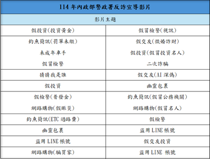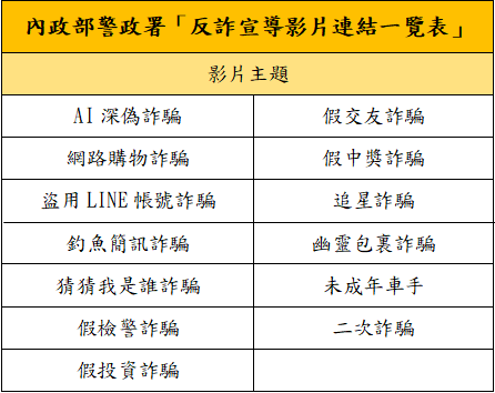 內政部警政署「反詐宣導影片連結一覽表」